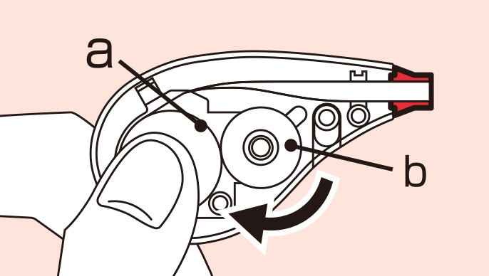 Remove the cartridge as described in ② and take up the slack by turning the take-up reel (b) in the direction of the arrow while holding the tape core (a) from the other side.