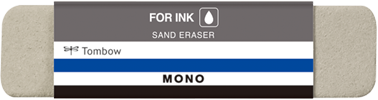 Non-PVC eraser made of natural rubber and silicon dioxide, scrapes off letters along with the paper surface.