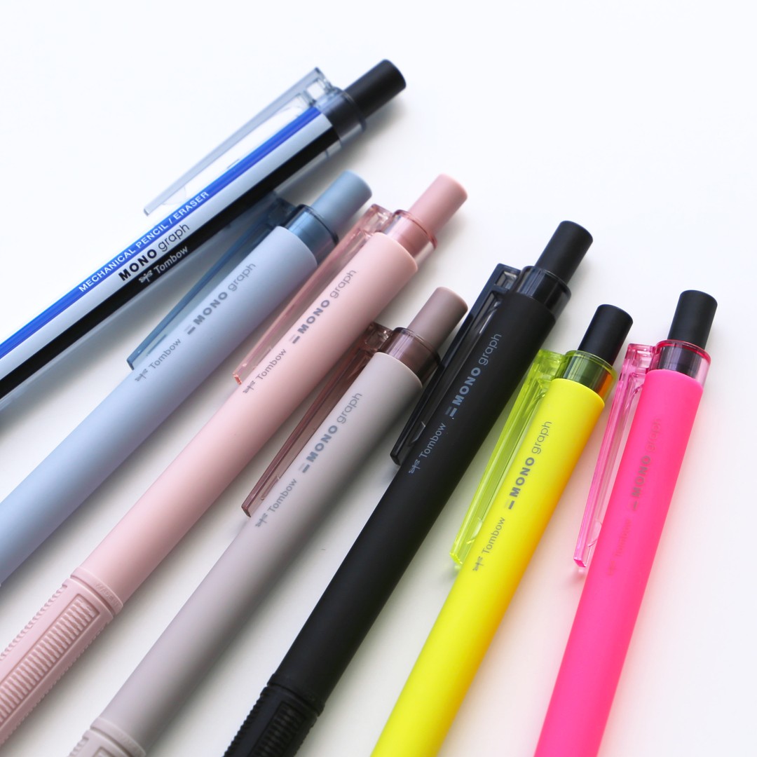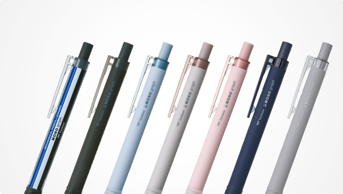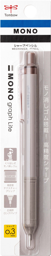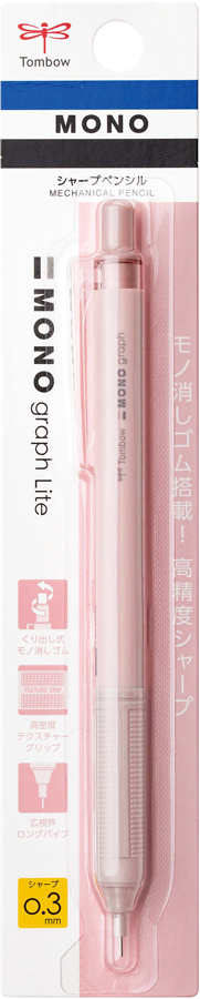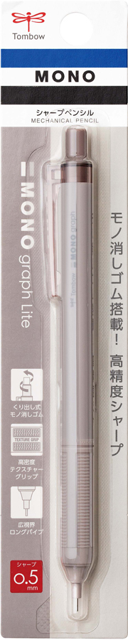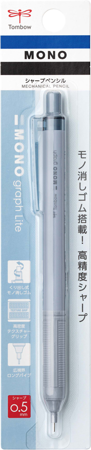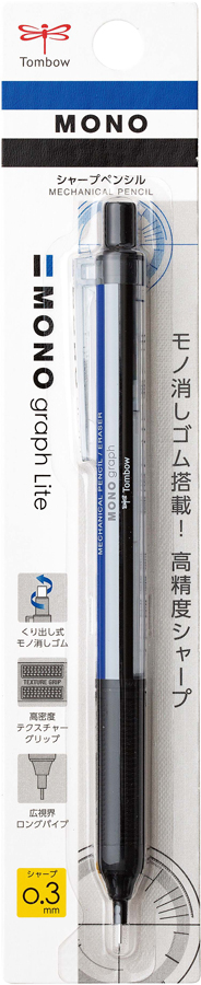 Mono brand designed mechanical pencil equipped with a retractable Mono eraser, a wide writing field of view, long pipe, and a high-density textured grip to prevent fingers from slipping.