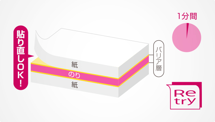 Tombow's unique technology controls the adhesion speed! The newly developed "Retry Tape" can be reapplied for about a minute after application. The tape adheres permanently over time.