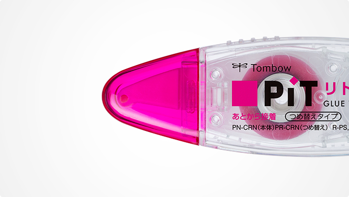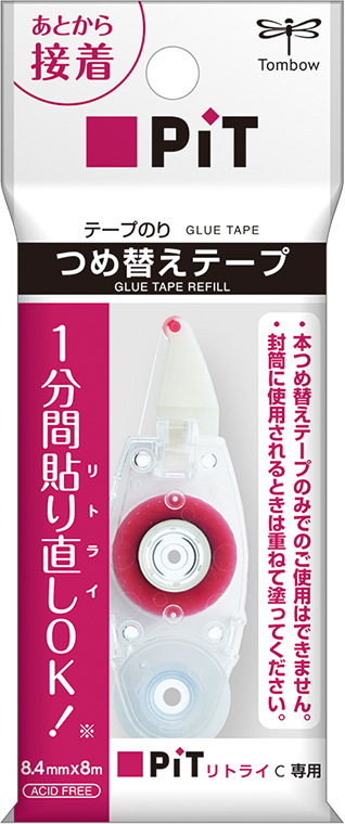 The glue tape "Pit Retry C" allows reapplication to correct mistaken and poor application. An easily refillable compact body with a new head and tape.