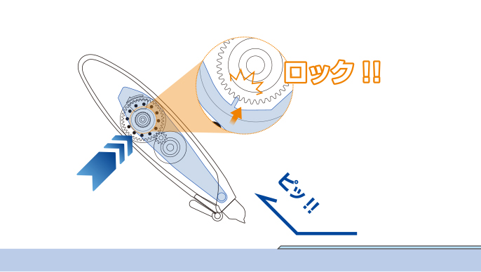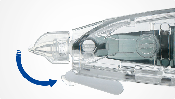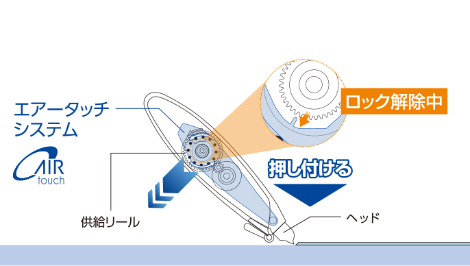 テープ走行をコントロールする独自機構「エアータッチシステム」を搭載し、修正テープを切るための抵抗を軽減。使い始めから使いきるまで驚くほど軽い消し心地を実現しています。