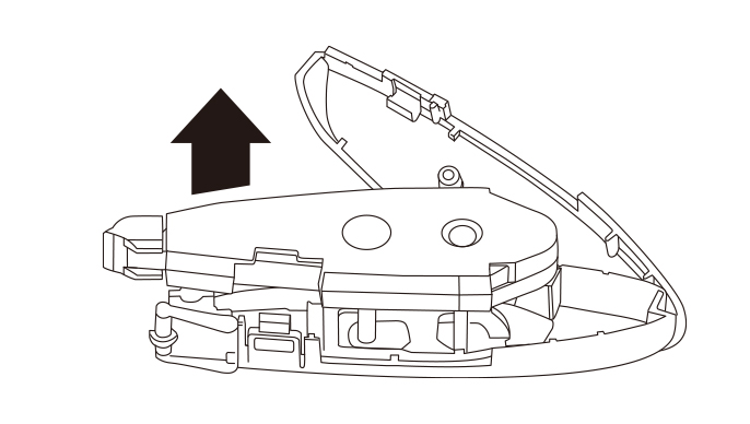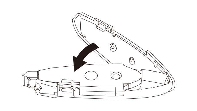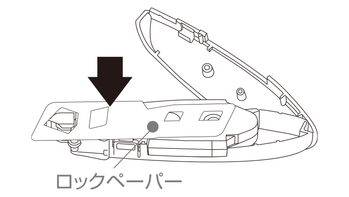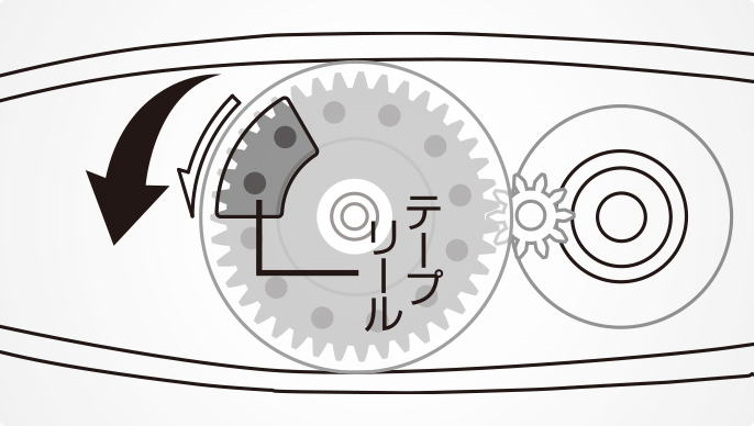 先端のとがったものなどで裏面のテープリールを矢印の方向に回し、たるみを巻き取ります。