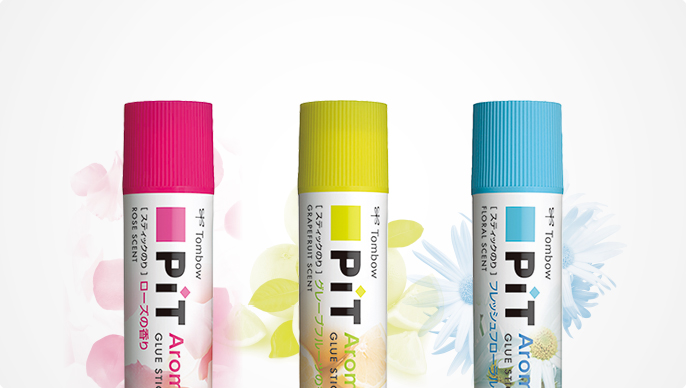 スティックのりの定番「ピットハイパワー」の香り付きタイプ。人気の3種の香りをラインナップしました。ほのかなアロマで、いつもののり付け作業がもっと楽しくなります。