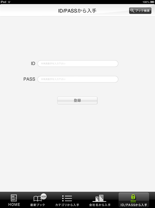 右下の[ID/PASSから入手]をタップし、予め決めていただいたIDとパスワードを使用してください。