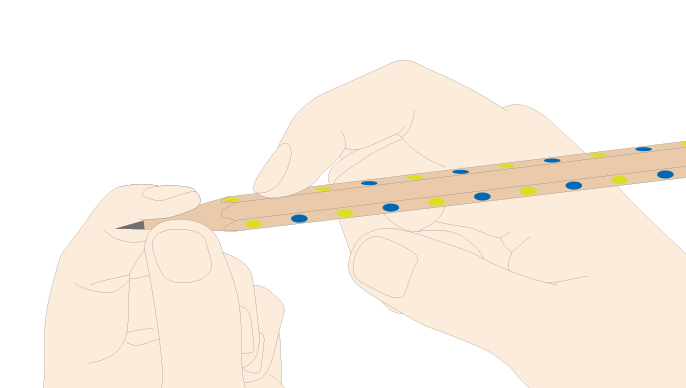 (2) Place your thumb on the same color ● that is two sides away, slightly behind the index finger; skip one side for hexagonal pencils; on the adjacent side for triangular pencils.