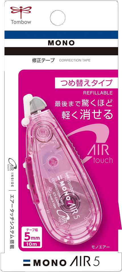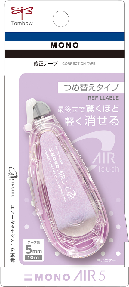 Refillable "Mono Air" correction tape equipped with the "Air Touch System“ for effortlessly light correction tape application from start to finish.