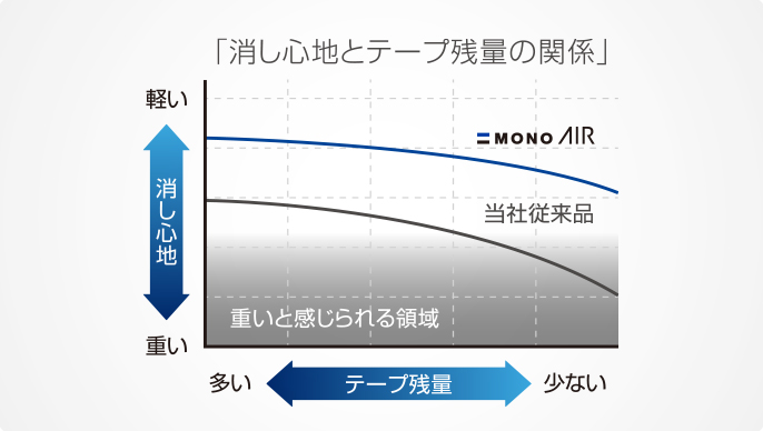 Other correction tapes require more pressure toward the end of the tape, yet "MONO Air" allows effortless tape application from beginning to the end of the tape.
