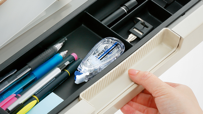 The compact body size that fits neatly in a desk drawer is loaded with a 10m long tape.