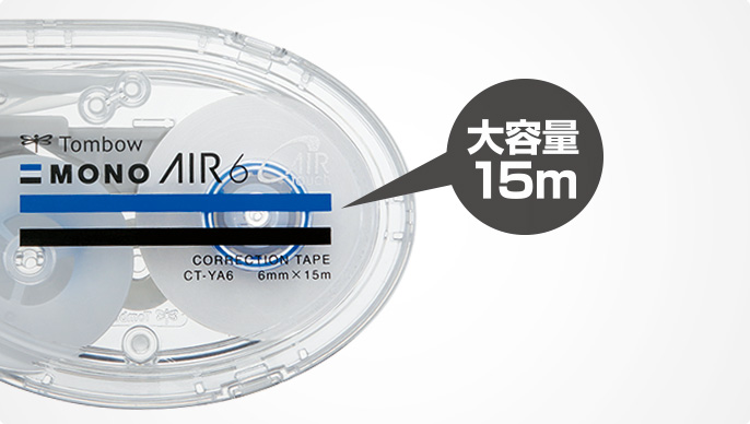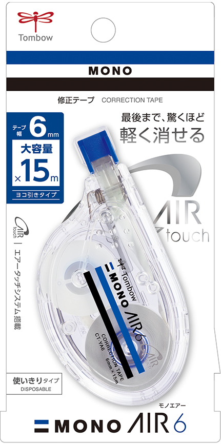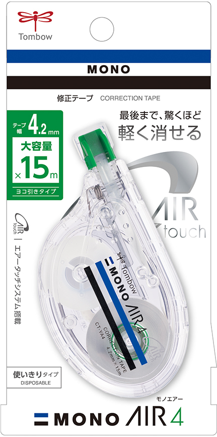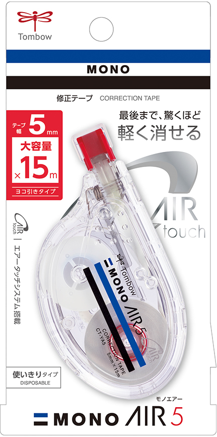This side action type of the correction tape "MONO AIR" with the "Air Touch System" only requires surprisingly light pressure from the beginning to the end of the tape. The longest tape of the series is also easy to hold and ensures stable performance.