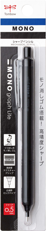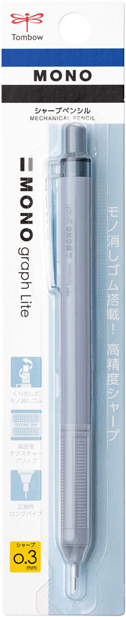 Mono brand designed mechanical pencil equipped with a retractable Mono eraser, a wide writing field of view, long pipe, and a high-density textured grip to prevent fingers from slipping.