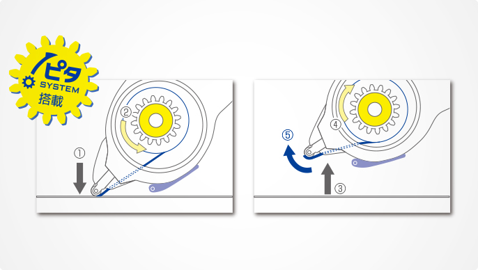 ①The body sinks as pressure is applied and ②the gear rotates. ③When the head is lifted from the paper surface, ④the gear returns to its original position and ⑤the tape advances. -