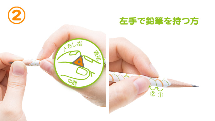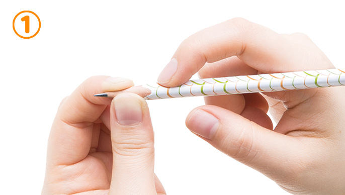 ③ Hold the middle finger and place a pencil on the forefinger. Make the pencil in the angle of 60° and extend the spine and write in the correct posture.