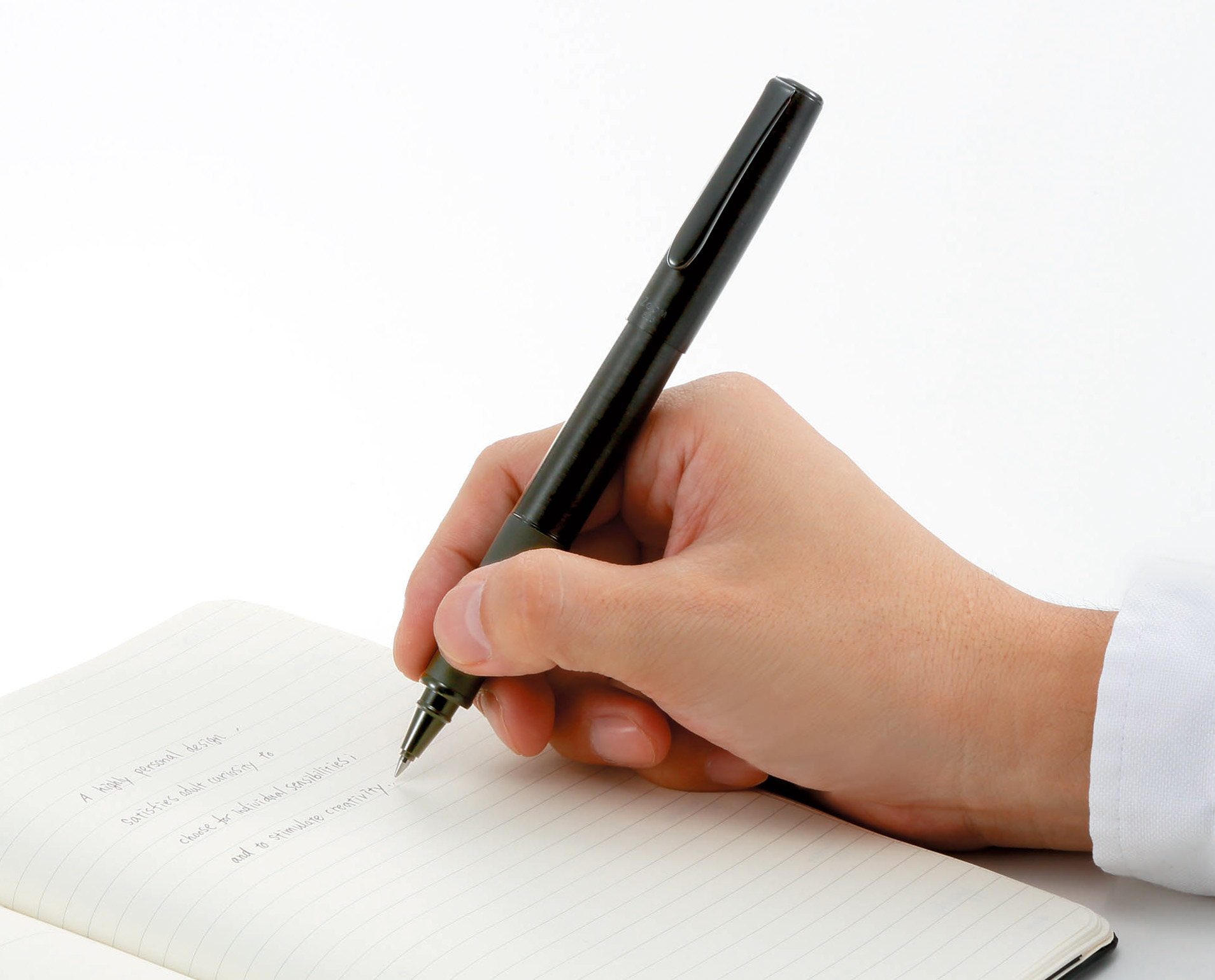 筆圧を要せず、濃く、くっきりとした筆記ができる。乾くと水や油ににじみにくく、耐光性に優れるため公文書などの重要書類に適します。水性顔料直液方式、0.5mmボール(極細字)、ステンレスチップ。