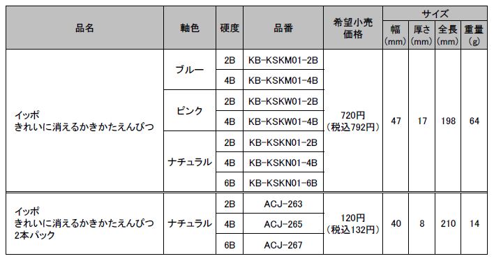 本製品は2B、4B、6Bの3硬度、軸色はブルー、ピンク、ナチュラルの3種=写真下=。希望小売価格は1ダース(箱入り)720円(税込792円)、2本パック(ナチュラルのみ)120円(税込132円)です。年間販売計画は数量で約170万本、金額で約1億円(小売価格)です。