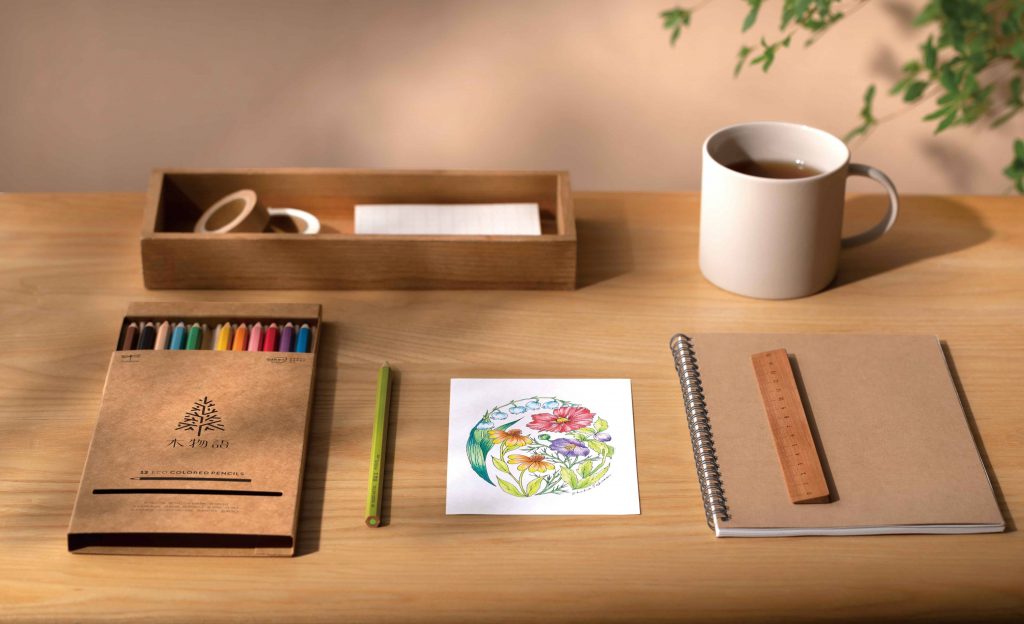 「色鉛筆 木物語12色」の特長は、①ひと塗りで濃く描ける、②タッチが軽くなめらかに塗れる、③六角軸色鉛筆(森林認証材)、④軽いクラフト紙のケース等で、色鉛筆アートを豊かにします。また、色鉛筆画に初挑戦の方、筆圧が不安定なお子さまや高齢者にも適します。