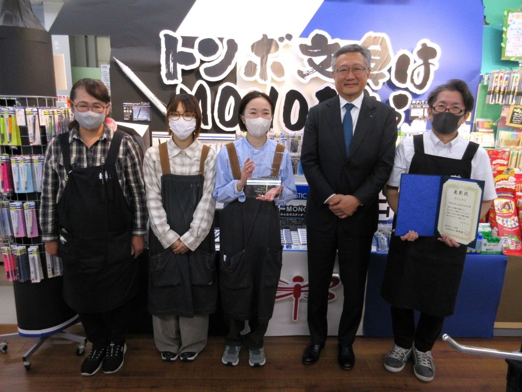 【写真右から】COMPASS yonago R431店 高木康介店長様、トンボ鉛筆 代表取締役社長 福嶋潤一、