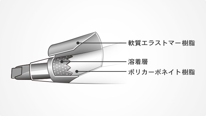 グリップ部にエラストマー樹脂をダブルインジェクションしました。 汗や摩擦で剥がれることなく、快適な握り心地が持続します。
