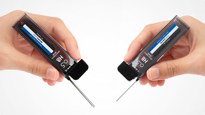 “なめらかな書き味”“芯の強さ”“描線の濃さ”のすべてを満たした高性能シャープ芯。ケースは「1本出し」と「まとめ出し」が選べるダブルガイド機構を搭載し、0.5mmHBにはシャープペン「モノグラフ」シリーズとあわせて選べるケースカラーをラインナップしました。