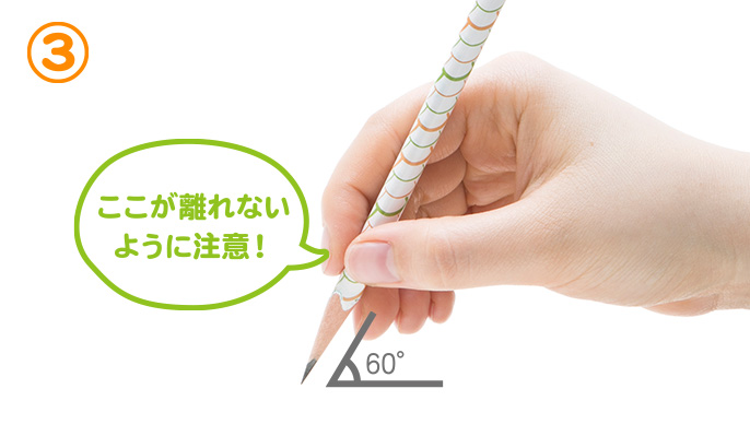 ③ 中指をそえ、鉛筆を人さし指につけるように立ててください。鉛筆の角度は60°にし、背筋をのばして正しい姿勢で書くようにしましょう。