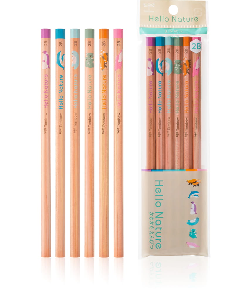 ナチュラルな木肌の軸が自然のあたたかさや心地よさを感じさせてくれます。6種類のどうぶつ(コウテイペンギン、ハンドウイルカ、ラッコ、コアラ、レッサーパンダ、タテゴトアザラシ)のイラストが入った鉛筆がセットになっています。